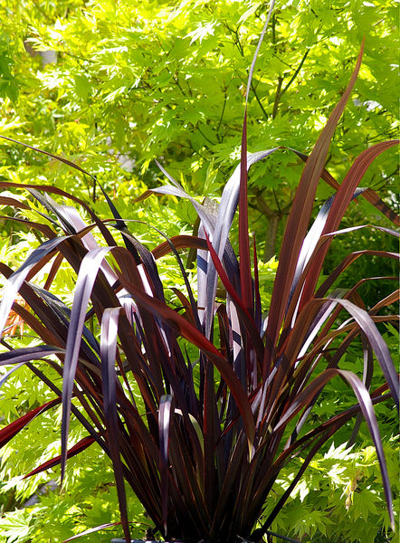 Wild-looking plants like Phormium are perfect to fill both pots and borders alike in jungle-themed gardens. Phormium Black Adder for example will create beautiful contrasts and will make the flowers and foliage surrounding it pop!
